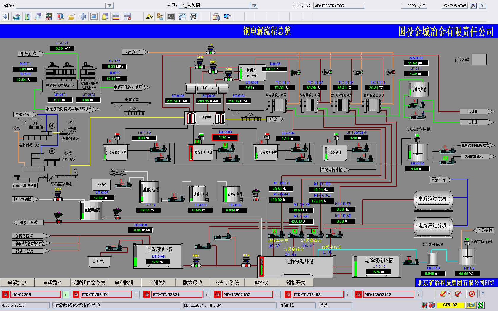 由九游(中国)总承包的湿法电解区域EPC工程总承包位于河南省灵宝市豫灵镇,生产流程为火法冶炼产出的粗铜,经过电解精炼产出精铜,阳极泥湿法综合回收贵金属。该工程包括电解车间和阳极泥处理车间,两车间相互独立,各设置一套DCS控制系统,均采用冗余控制器+工程师站+操作员站的架构,通过环网联通整个系统。采集的实时生产数据集中归档,并设置一台OPC客户端用于和全厂生产信息管理系统联网,实现全厂资源统一管理。DCS系统针对电解车间电解液加热调节阀频繁,设计带蒸汽压力前馈的PID温度调节,针对添加剂槽蒸汽大,重新设计仪表测量系统,稳定投料速度,减少表面凸瘤和粒子的产生。集成阳极整型机组、天车定位、电解槽短接开关系统、电解液循环过滤系统、阴极剥离机组、残极洗涤机组、真空蒸发机组等子系统,集中显示调配关联数据,方便工艺监控生产过程。