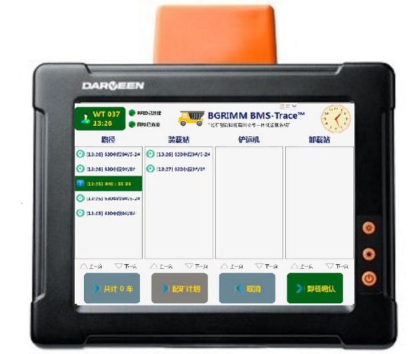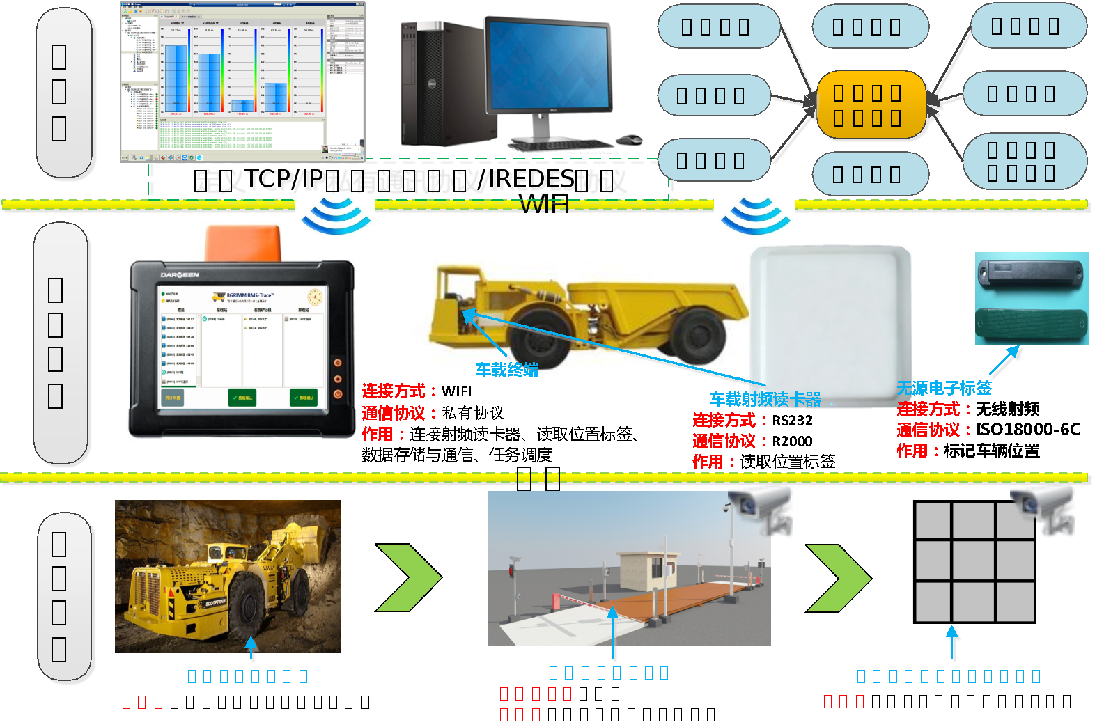 矿山无轨车俩运输计量管控系统融合车载无线通讯技术、射频识别技术、人工智能模式识别等多种先进技术手段,实现矿山无轨运输装备实时通信、车辆精确定位、轨迹查询、装卸矿位置识别、称重计量、卸矿抓拍、运量统计、配矿计划、溜井料位监测等功能,可显著提升矿山企业生产作业安全、高效以及精细化水平。