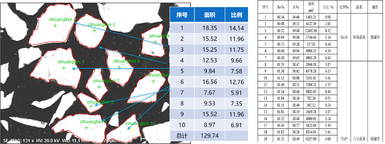 战略性矿产资源往往具有贫、细、杂的特点,通过对元素赋存状态、目的矿物粒度、矿物含量等矿石基因特性的精确表征,评价资源的可利用性,诊断选矿工艺流程问题,为选冶技术的创新发展明确方向。微细粒贵金属矿物量化表征技术:针对金、银、铂族等贵金属矿物,结合矿石矿物性质研究和矿物自动分析方法,实现矿石中微细粒贵金属矿物的追踪,量化其粒度、分布关系等重要基因特性,为贵金属综合回收利用技术开发提供科学依据。稀有稀散资源的元素原位微区分析及赋存矿物精细化分类定量技术:主要针对锂、铍、钽、铌、稀土、铟等资源,结合电子探针原位微区分析、扫描电镜能谱分析以及矿物自动分析等方法,实现这些元素在矿物中的原位微区含量定量分析,为元素赋存状态研究奠定基础。关键矿物分类定量技术:金属矿床中某些关键矿物由于矿物晶体结构差异,造成其物理化学性质的差异,成为影响选矿指标的重要因素。针对在铜、锡矿山中最常见的磁黄铁矿,通过矿物晶体结构、主控硫铁元素含量及特征微量元素等矿物微观特征变化进行颗粒差异性分类,并结合矿物原位图像赋值研究,实现不同选别性质磁黄铁矿的单独定量,为选别流程的制定和优化指明方向。