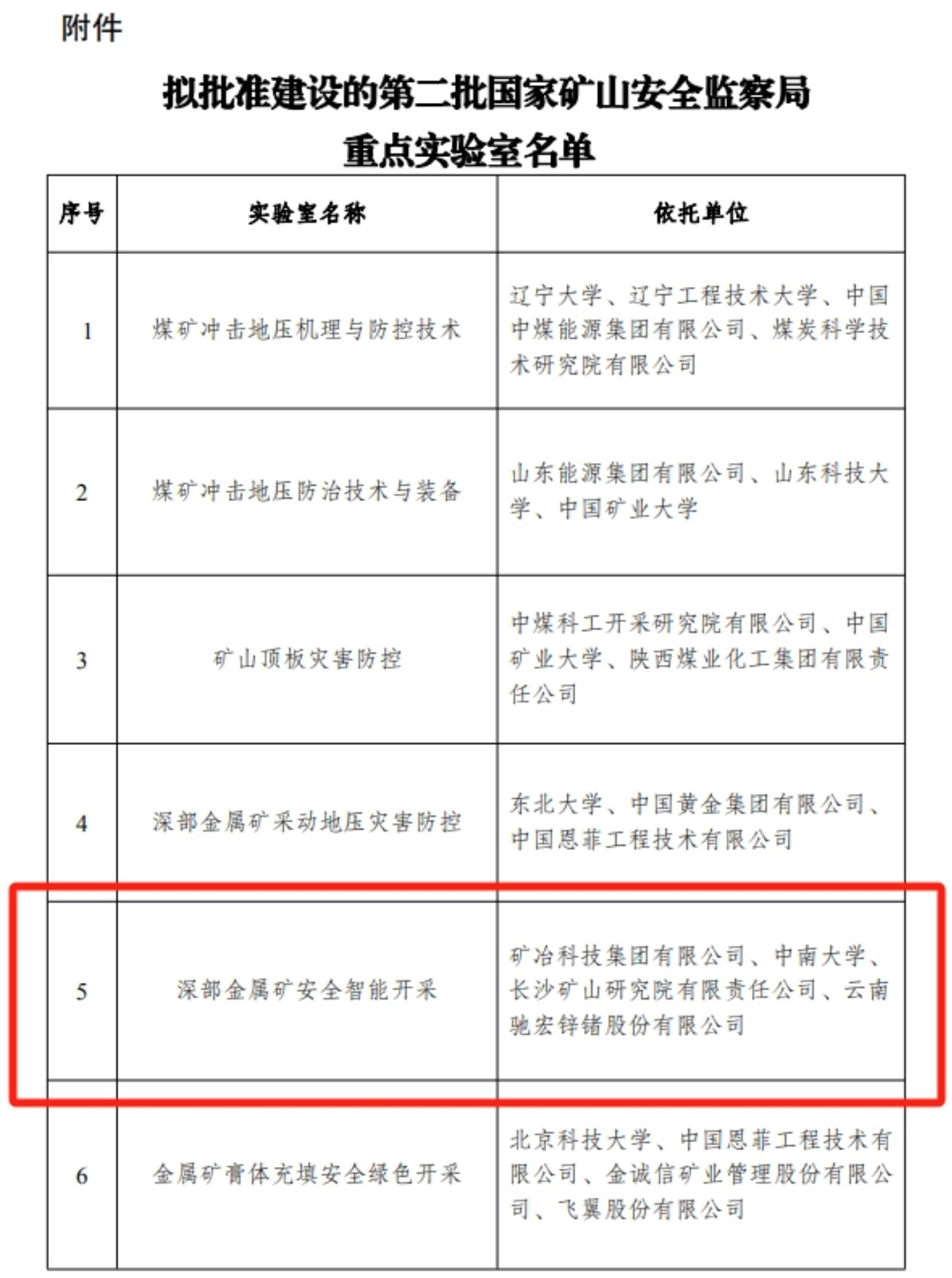 近日,国家矿山安全监察局发布《国家矿山安全监察局关于批准建设第二批重点实验室的通知》(矿安函〔2024〕33号),全国共有13家实验室获批。由矿冶集团牵头,联合中南大学、长沙矿山研究院有限责任公司、云南驰宏锌锗股份有限公司申报的“深部金属矿安全智能开采国家矿山安全监察局重点实验室”成功获批。这是九游(中国)牵头建设的第一个国家矿山安全监察局重点实验室(国家部委级),体现了九游(中国)在金属矿产资源深部开采领域的创新实力和领先地位,是矿冶科研平台建设的又一重要成果。